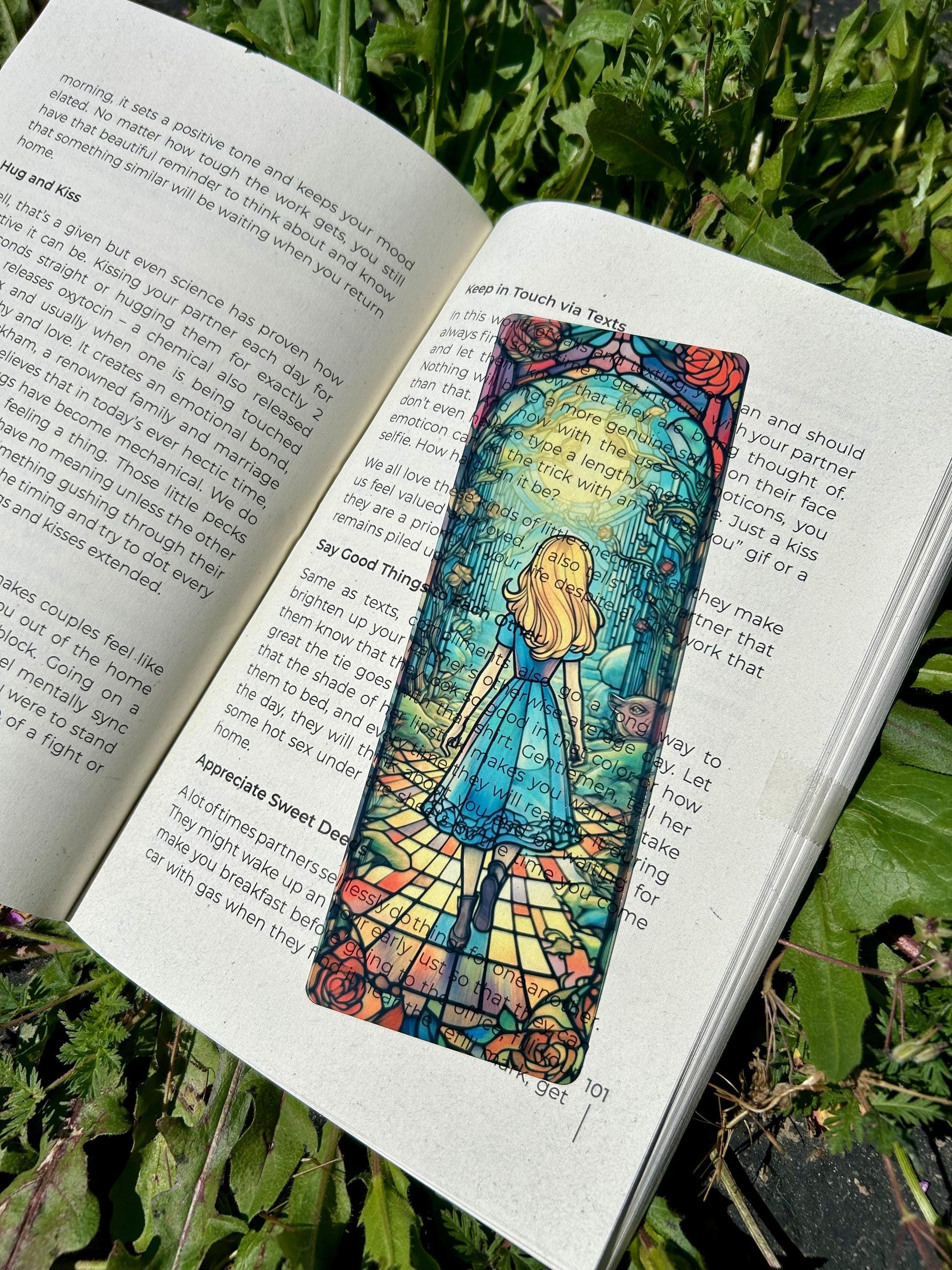 The Coolest Bookmarks You've Probably Ever Seen.... Step into a whimsical world with the Alice in Wonderland Stained Glass Bookmark! Featuring enchanting fairy tale art, this design captures the magic and adventure of Wonderland, making it the perfect accessory for fans of the classic story and lovers of whimsical adventures.