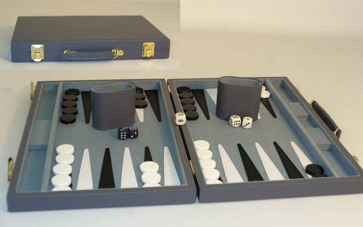18" Grey Vinyl Backgammon Set Grey Vinyl Backgammon Attache with Handle - Black & White Stitched Pips - 2 Cups - Dice - Doubler. Dimensions 22" x 18" Open.