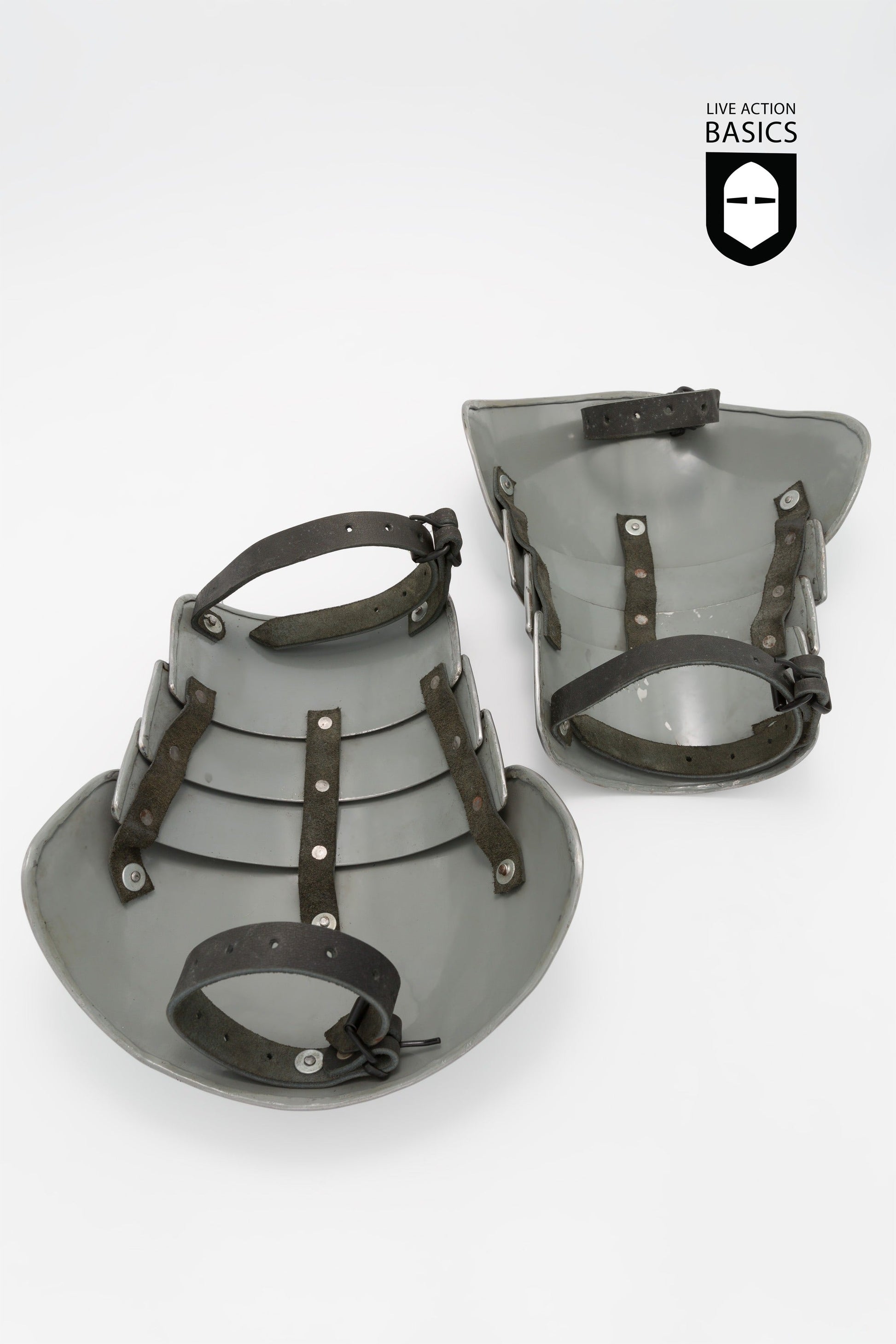 These pauldrons offer sufficient shoulder coverage with layered panels to allow for ease of movement. They are fastened securely in place via straps on the underside which attach to the arm and shoulder.