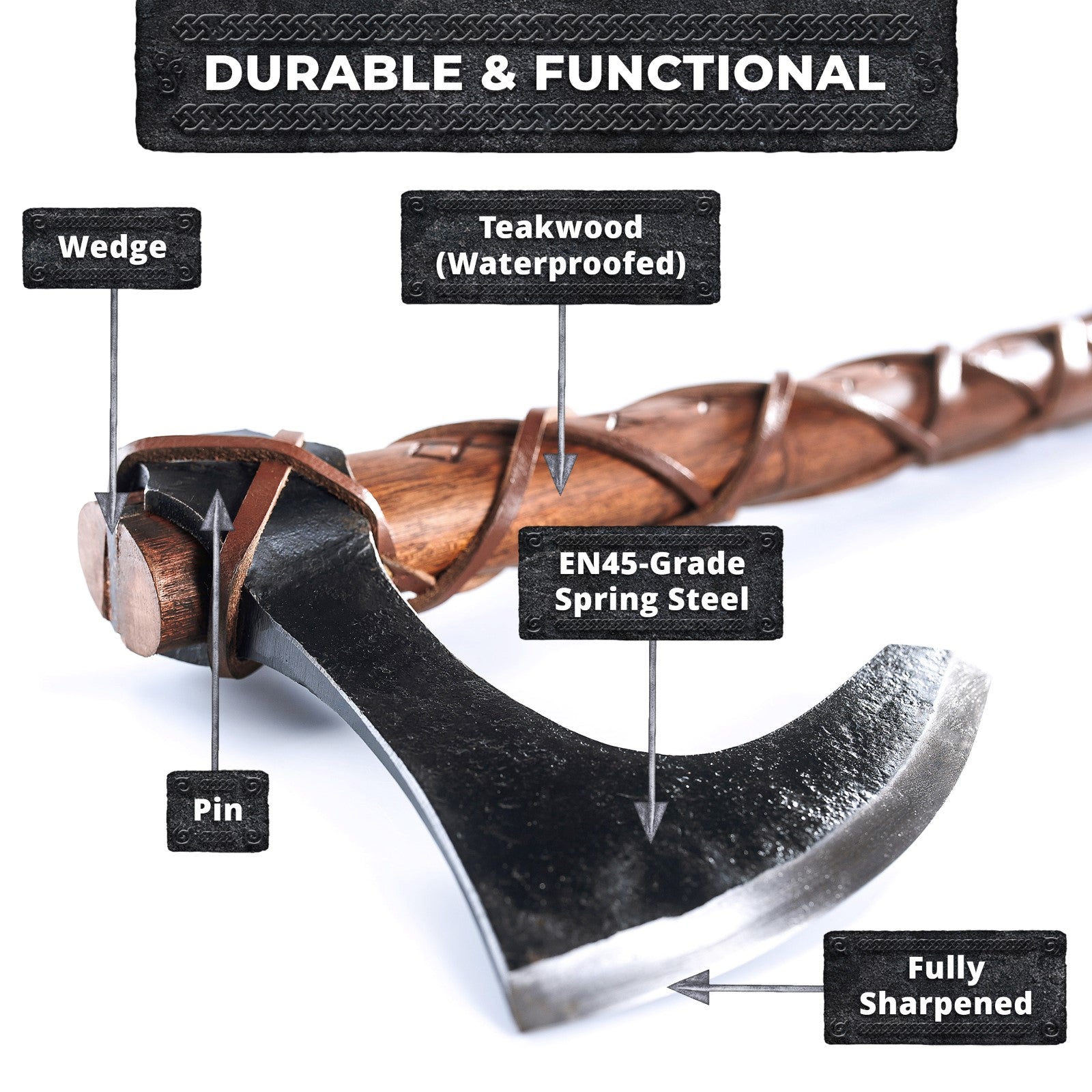 ⚔️ BUILT FOR USE - While we do not endorse this item as a weapon, it is no toy. It is fully functional as a tool or an authentic reenactment piece. The axe handle is made from one piece of quality aged teakwood, one of the most hard and durable timbers available. The handle features features a thick harness leather cross stitch and grip. Also, this axe is NOT a log splitting maul made for chopping heavy logs.