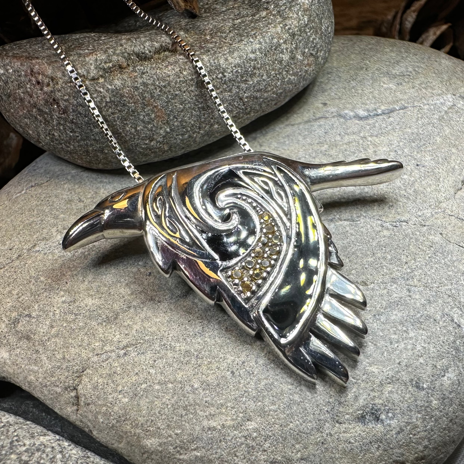 The mythical wisdom of a Raven ~ Solid Sterling Silver Necklace with Beautiful Gemstone.