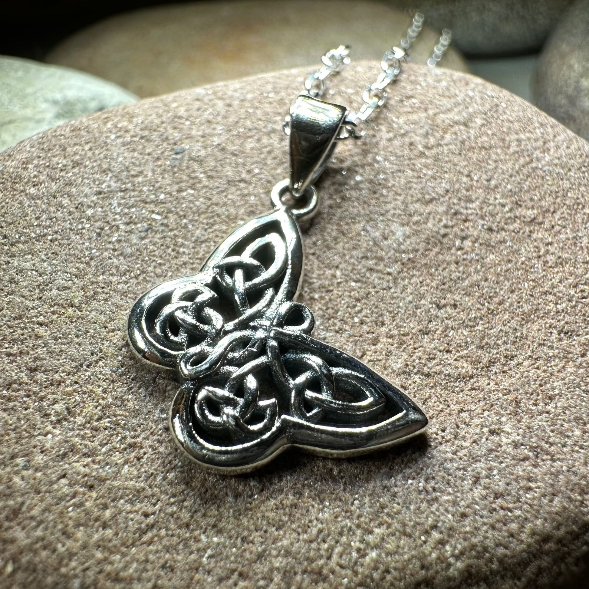 Welcome change into your life and let your spirit dance like a butterfly on the breeze. This beautiful pendant must be seen to be believed. Elegant and feminine, the intricate butterfly is created with solid sterling silver Celtic knot work with creamy blue enamel backdrop to highlight the silver. The edge of the tear-drop shaped pendant is studded with faceted cubic zirconia stones for a lovely sparkle.