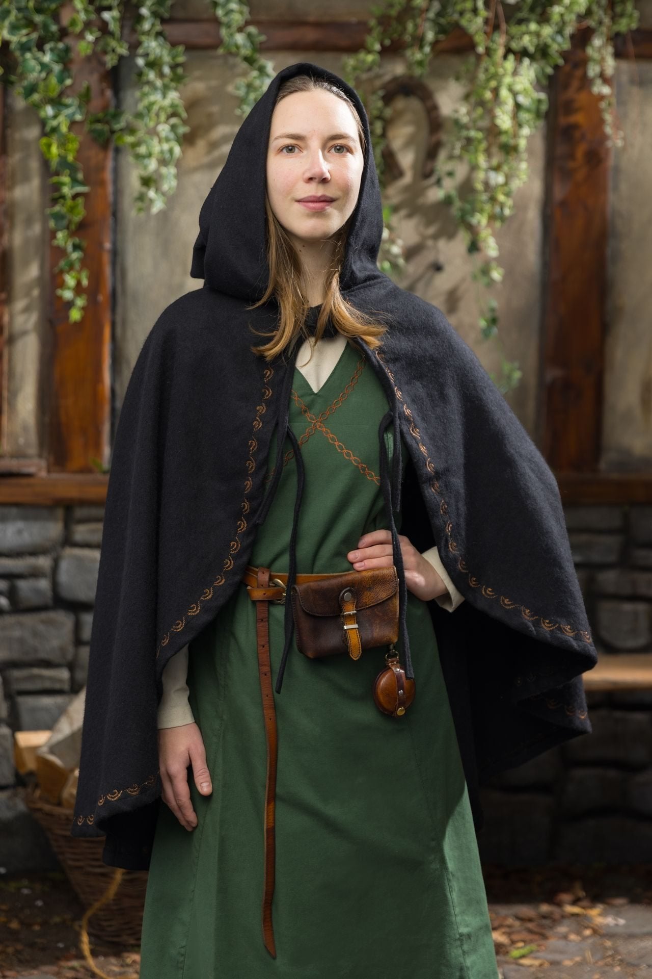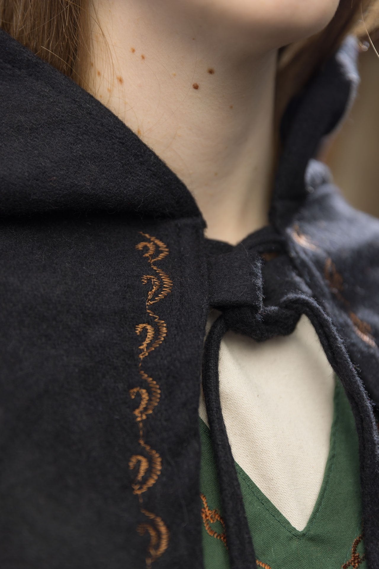 This beautiful, short cape, made of wool felt, warms up the body and soul. The different lengths in the front and back, the long pointed hood and especially the ornamental embroidery give the cape and its wearer an extraordinary, unique look. The cape can be closed with double lacing at the chest. Alternatively, a spiral brooch can be twisted through two loops at the front of the cape.