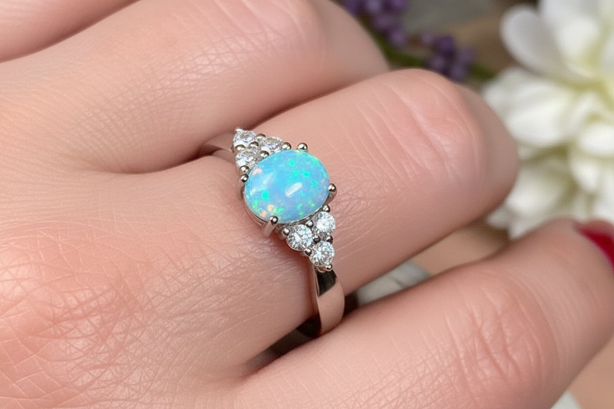 If you are looking for a ring that makes a feminine, but bold statement - this gorgeous sky blue opal ring is the one for you.