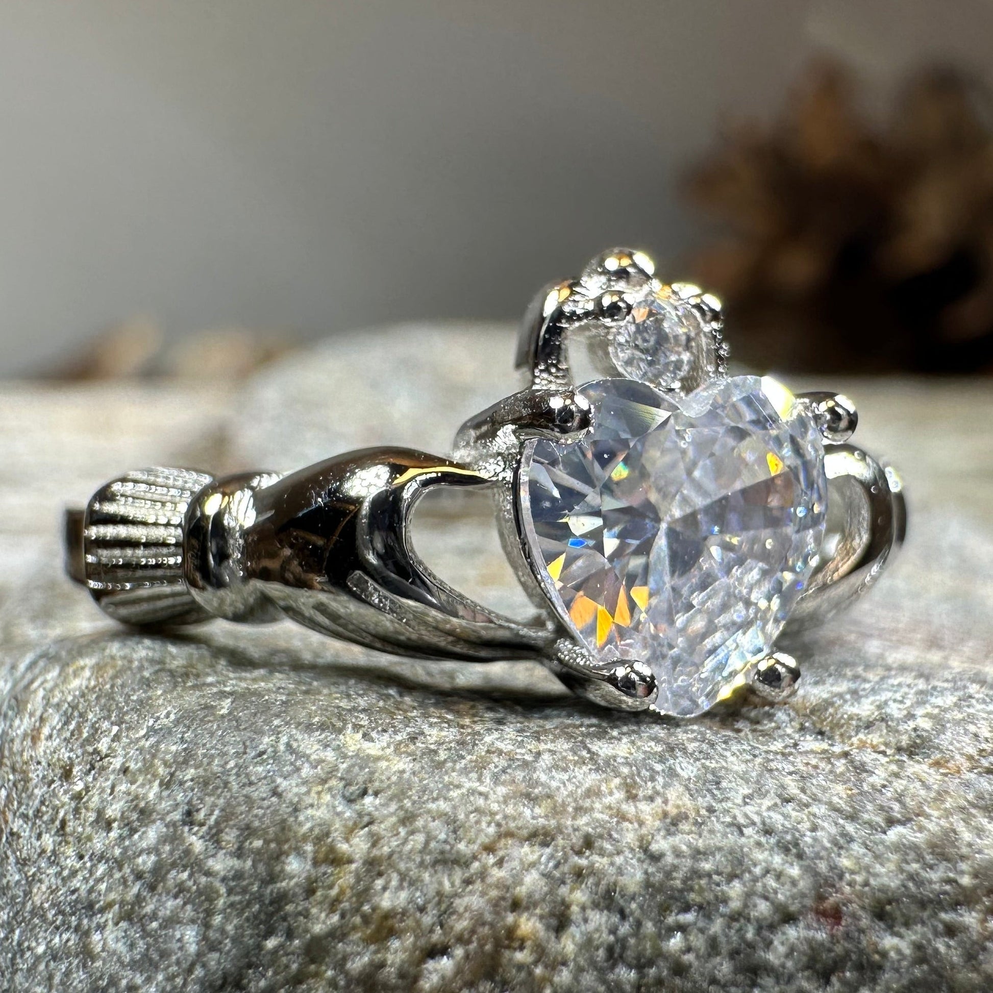 A unique design combining the traditional elements of the claddagh with celtic knot work - sterling silver with a heart shaped cubic zirconia. This gorgeous stone shines with a lovely sparkle!