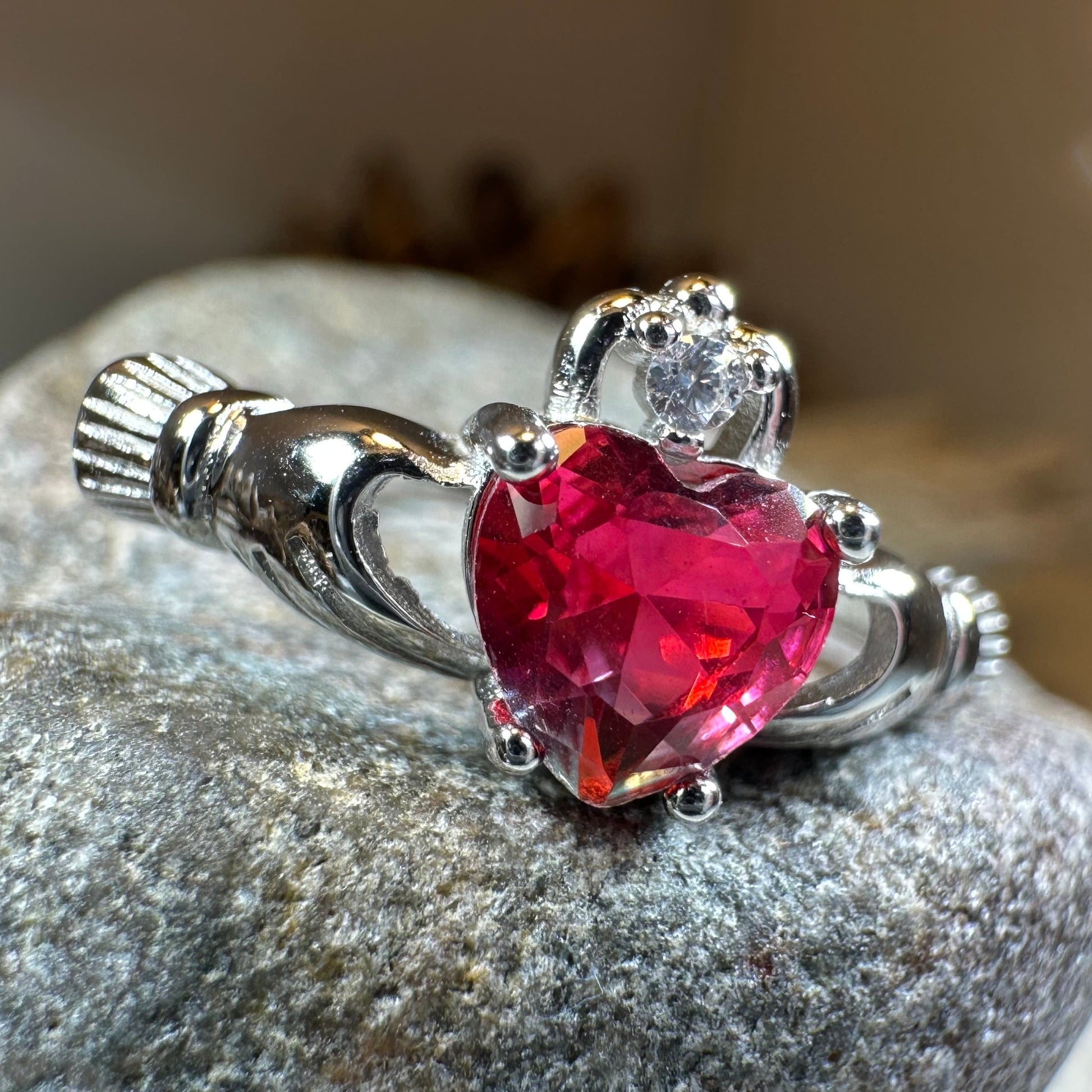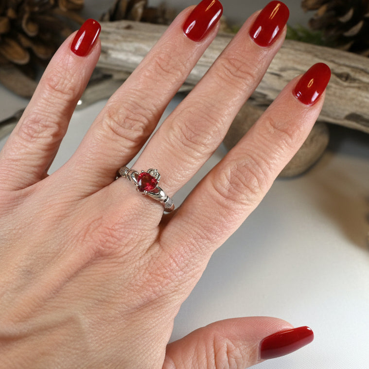 A unique design combining the traditional elements of the claddagh with celtic knot work - sterling silver with a heart shaped tourmaline zirconia with a diamond zirconia set in the crown.
