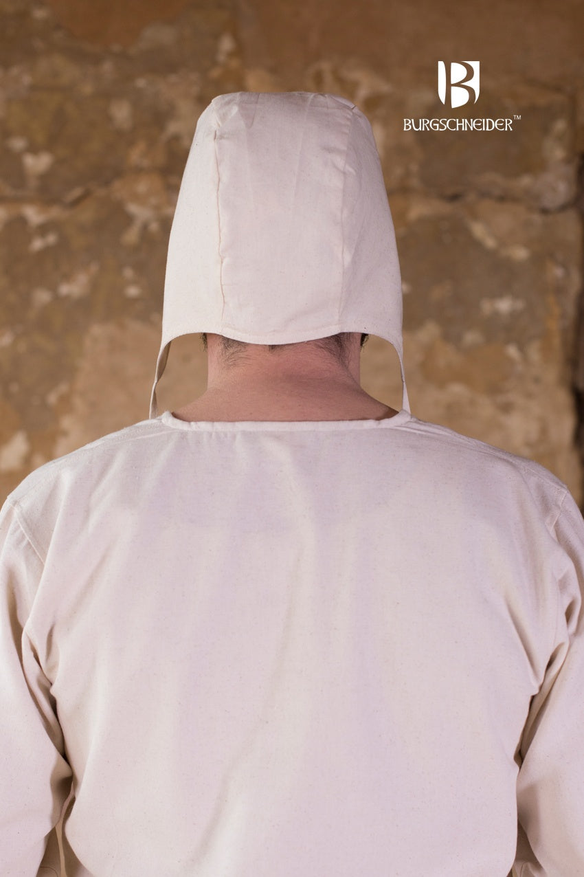 Our Coif Bertram is made of natural white cotton, a simple design that can be worn on all occasions. Classically, it goes to the neck and over the ears and can be closed with 2 ribbons.