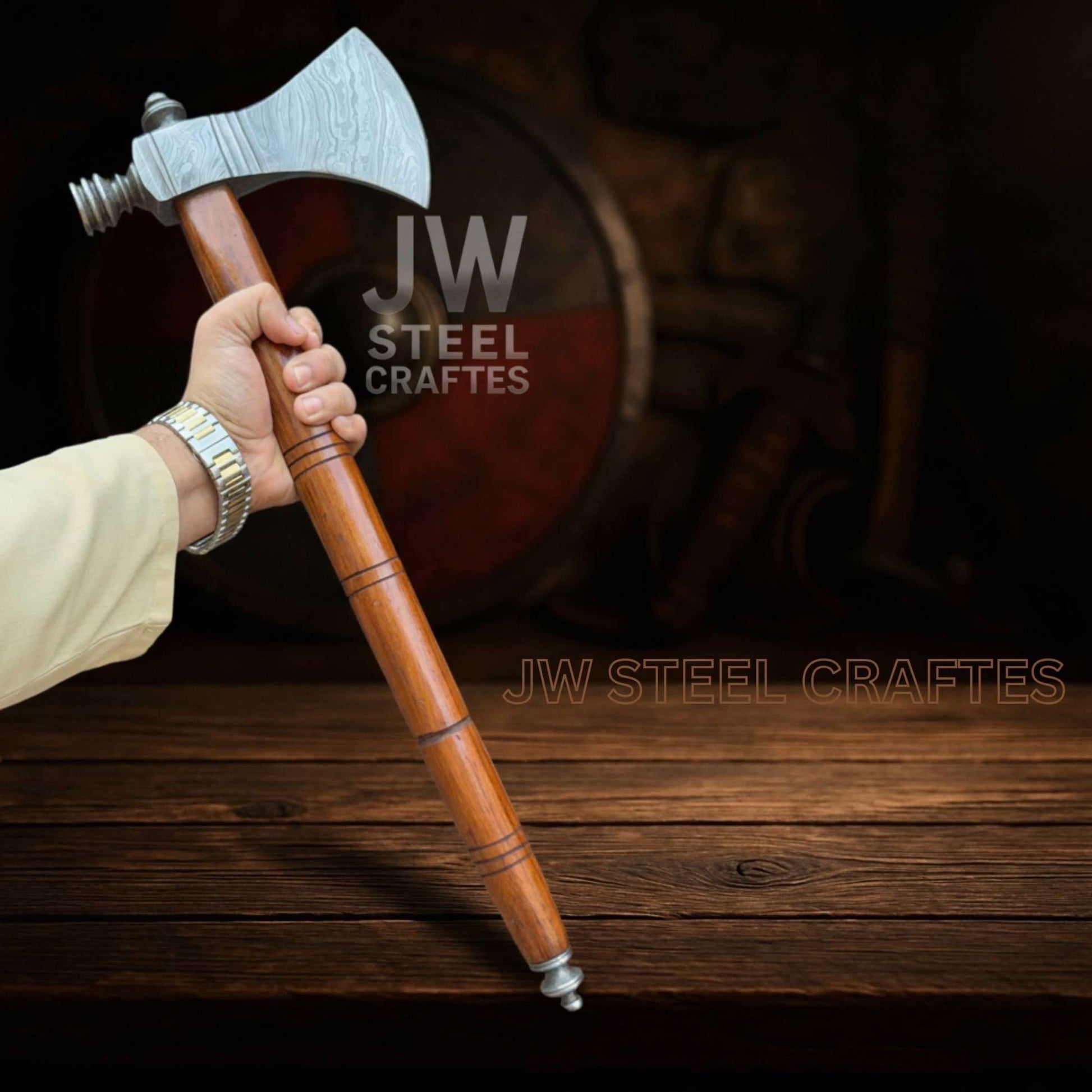 This handcrafted Viking-style tomahawk features a Damascus-pattern carbon steel head paired with a beautifully polished solid wood handle. Designed for collectors, medieval enthusiasts, and display lovers, this piece brings a bold historical aesthetic to any setting.