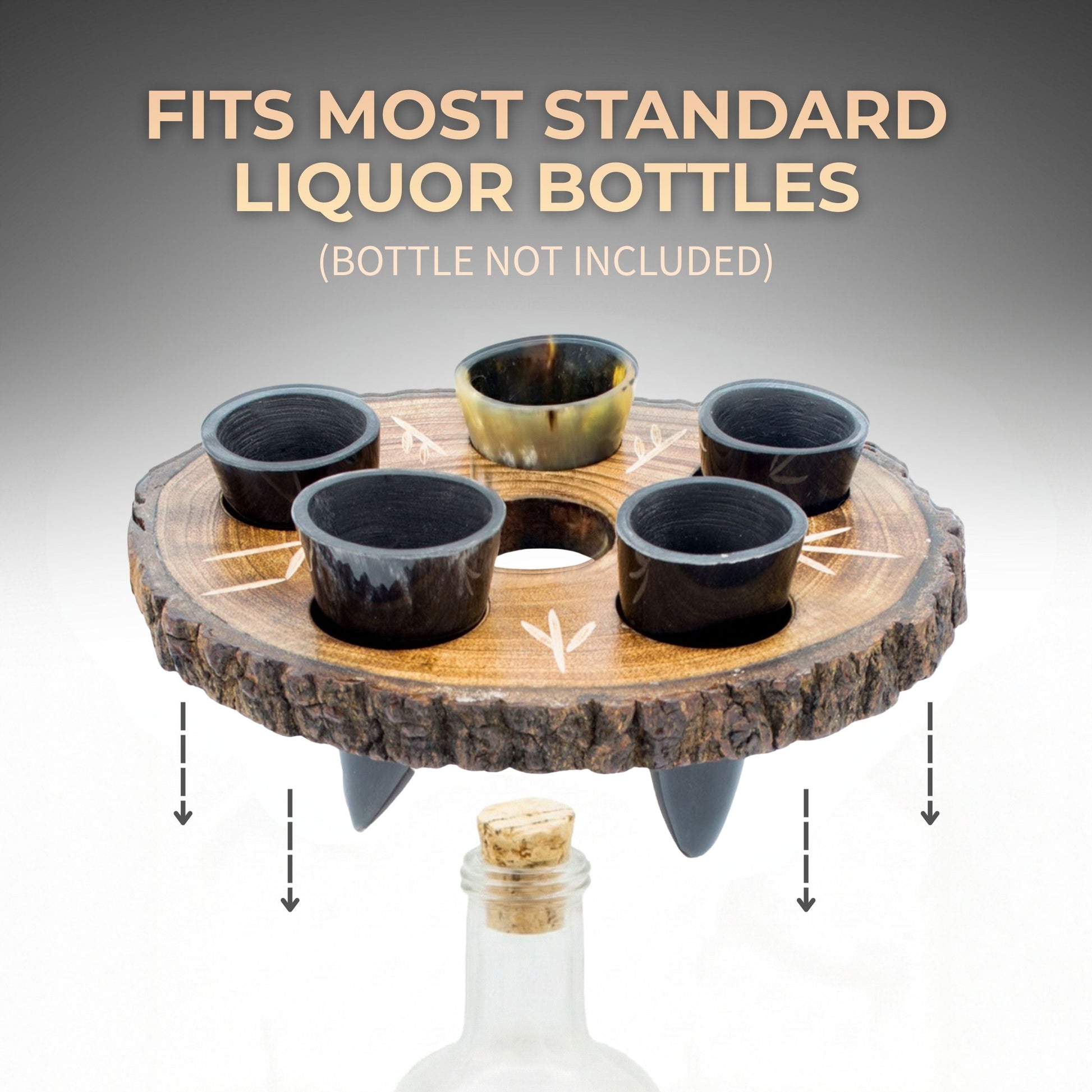 The wooden serving platform is designed to set atop a liquor bottle of your choosing. The center hole should be placed over the mouth of the liquor bottle. Then, spirits can be poured into each horn from any other flask or bottle of your choice.