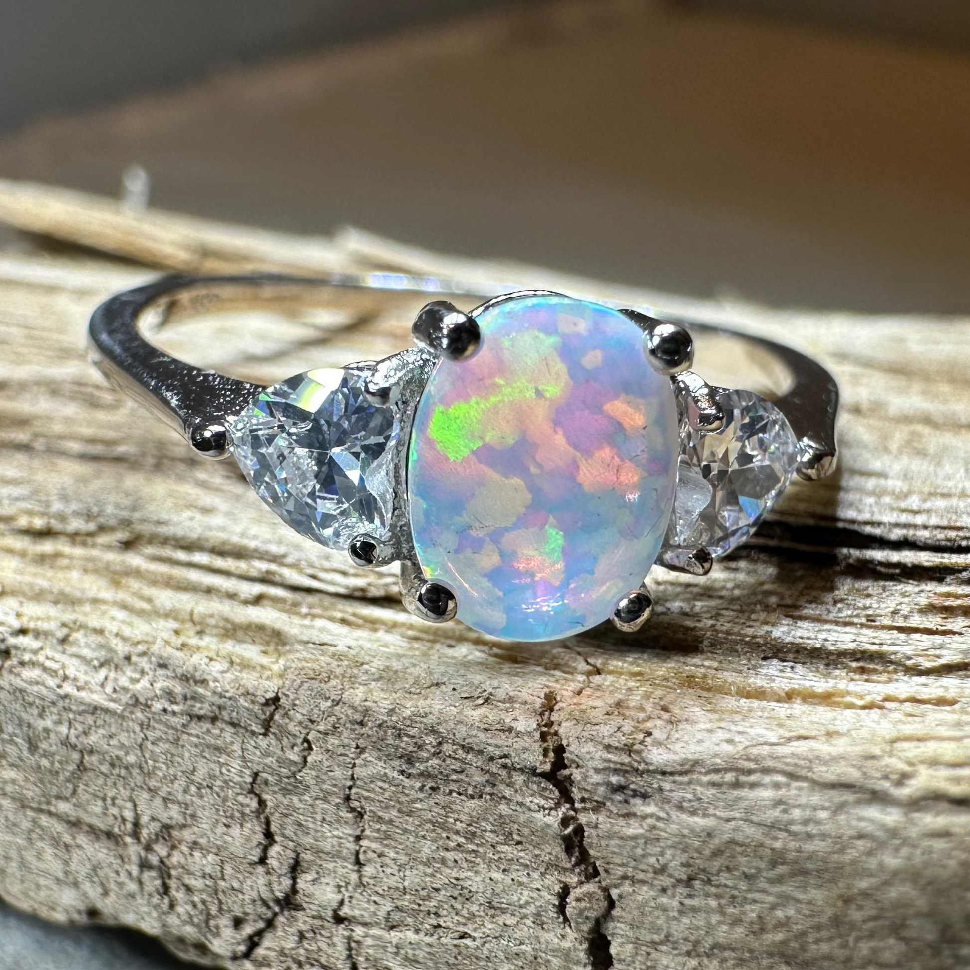 Solid Sterling Silver with created white fire opal and diamond zirconia side stones