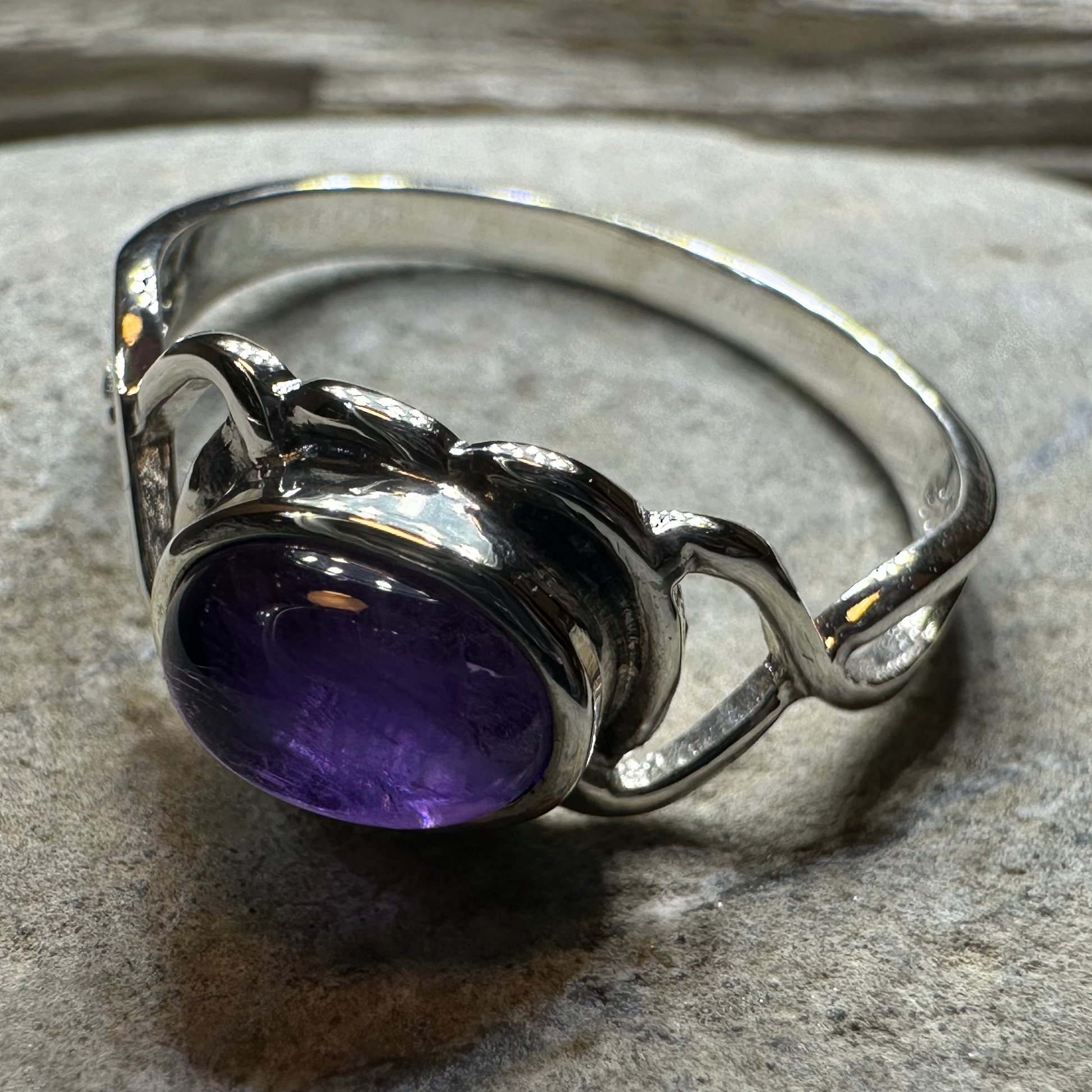 A unique design combining the traditional elements of the Celtic knot with a modern twist - solid sterling silver with a beautiful large, cabochon natural amethyst stone that glows with a gorgeous purple color.