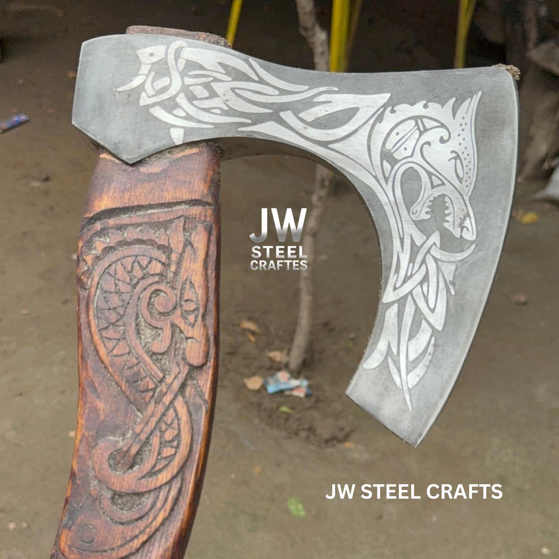 Hand-Engraved Viking Bearded Axe with Carved Hardwood Handle – Damascus Steel Blade | JW SteelCrafts