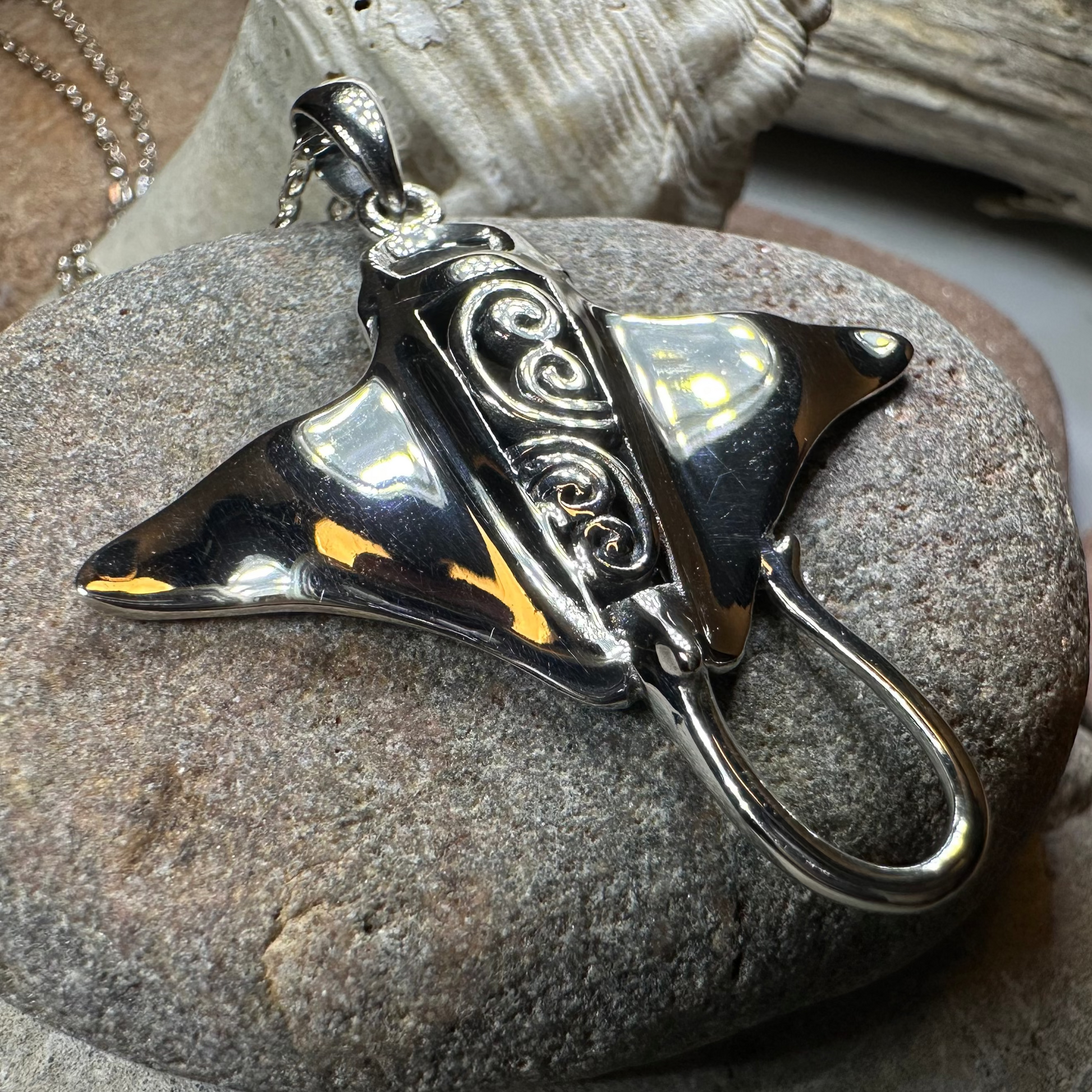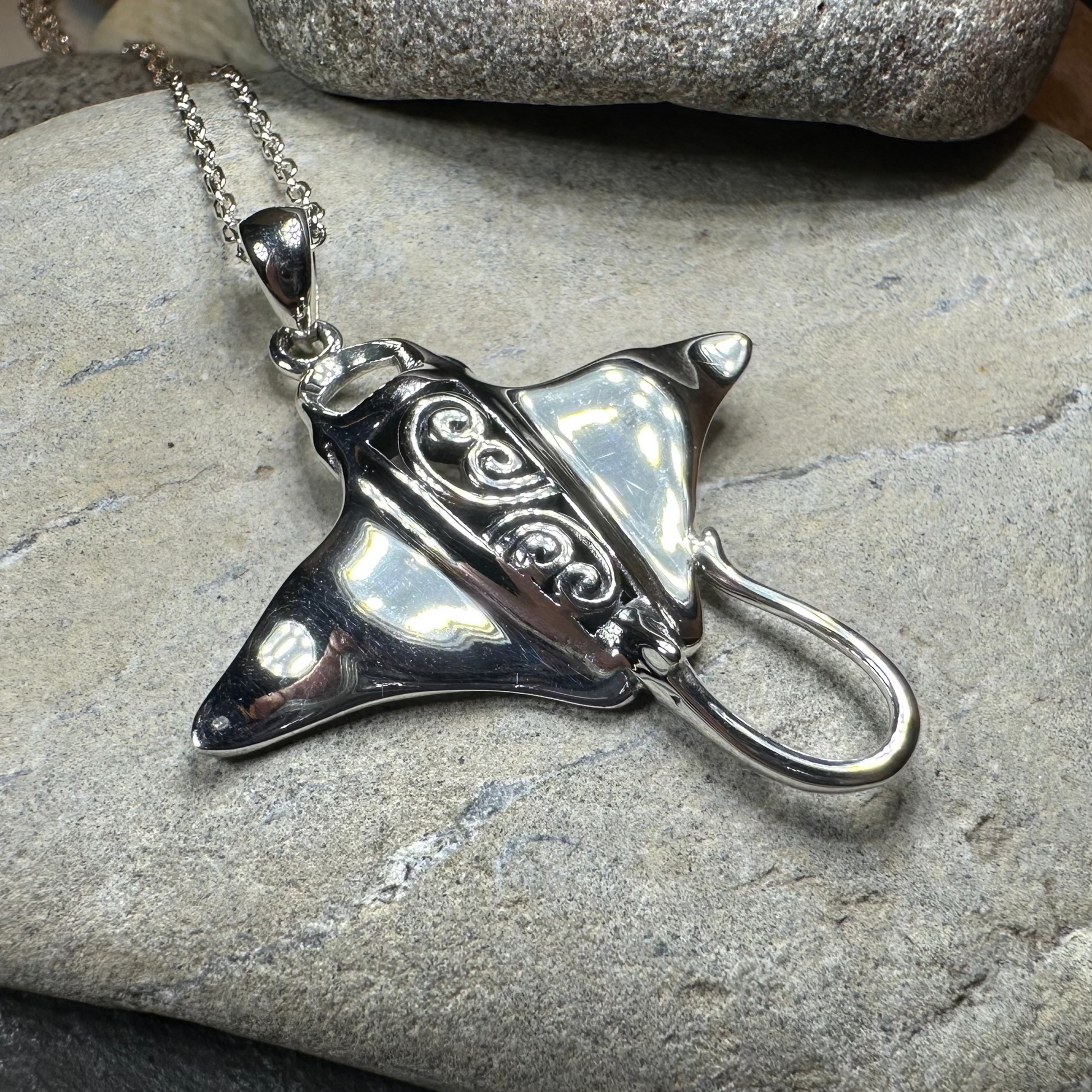 Highly polished and featuring elegant 3D construction, this handcrafted Celtic Manta Ray Sterling Silver Pendant showcases the beauty of nature and the exquisite craftsmanship