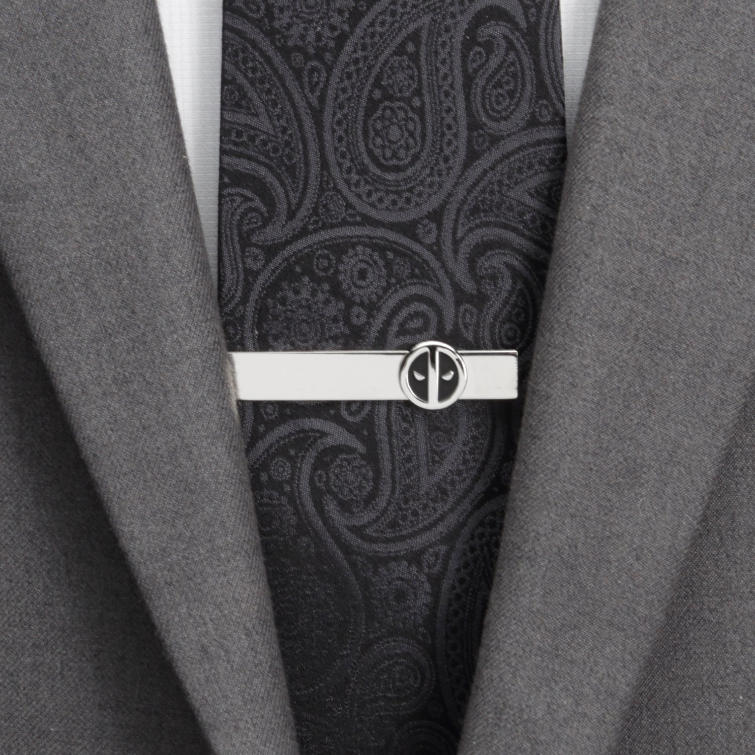 Break the fourth wall with this fun Deadpool gift set. Our Deadpool gifts for him feature a pair of mask logo cufflinks and a matching tie bar, this Deadpool gift set also includes our favorite Deadpool black tie: look closely among the paisley pattern and you'll see a familiar face peeking cheekily out of the bottom. The ultimate gift for the well-dressed fan.