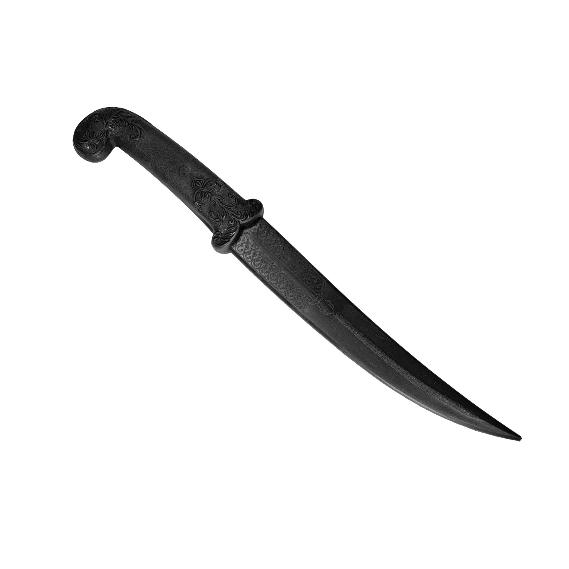High quality polypropylene rubber Middle Eastern Style Knife. The Blade has detailed engravings. The handle encompasses small floral details on the cross guard and pommel. The knife tip is slightly bendable making it safe for direct contact with Actors. This is a solid rubber knife that is perfect for use in police and tactical training as well as props when used in close proximity simulated fight scenes. This is an extremely durable prop.