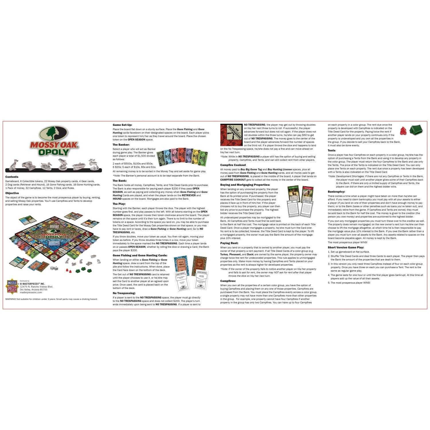 Grab your gear and head around the board with your fellow nature lovers, as you collect wildlife, birds, and fish on your way to the win! Fans of the great outdoors will love the nature trivia on the back of the property cards, learn about the many creatures that make the outdoors their home. Action cards feature humorous hunting and fishing sayings that will have you cracking up. Six metal playing pieces include a fish, a duck, a canine companion, and 3 more. Game includes a Game Board, 6 Collectible Metal Tokens, 22 Mossy Oak property Cards, 4 Gear Cards, 2 Dog Cards, 16 Gone Fishing Cards, 16 Gone Hunting Cards, 1 Pack of Custom Money, 32 Plastic Campfires markers, 12 Plastic tent markers, 2 Dice, and Rules. Collect the most properties to win! For 2-6 players, ages 8+. Officially Licensed Mossy Oak product.