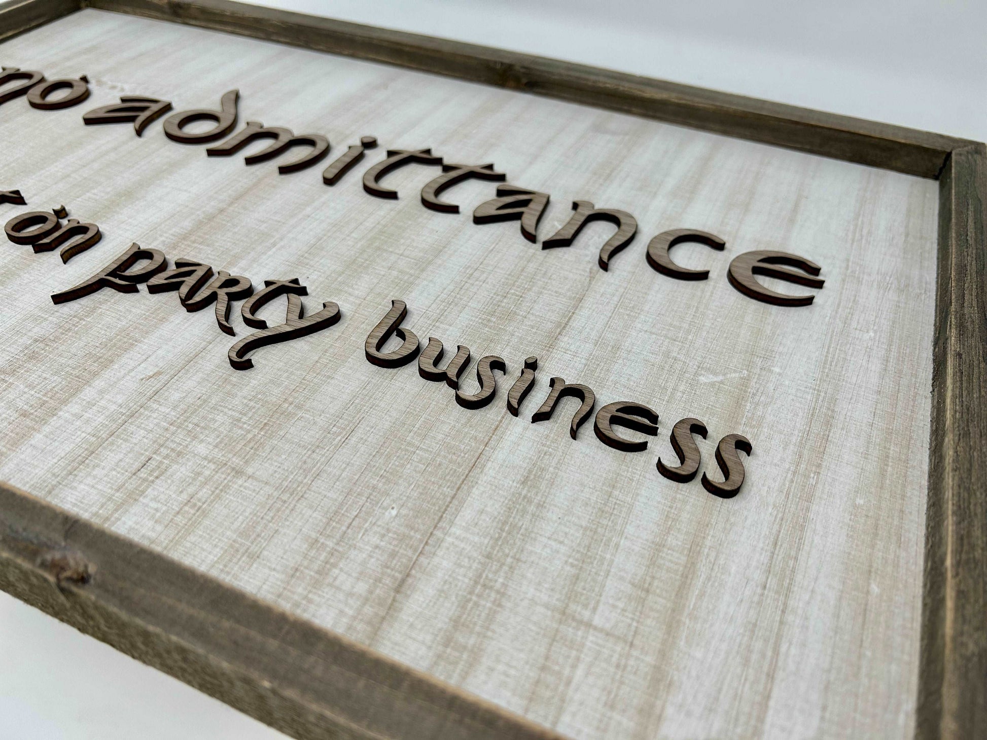 The Larger sign - 19"x12" comes with a picture hanging bracket (attached) and would make for a great wall-hanging in a den, study or man-cave. This sign has cut-out walnut letters applied to a white washed backer board and a rustic wood frame,