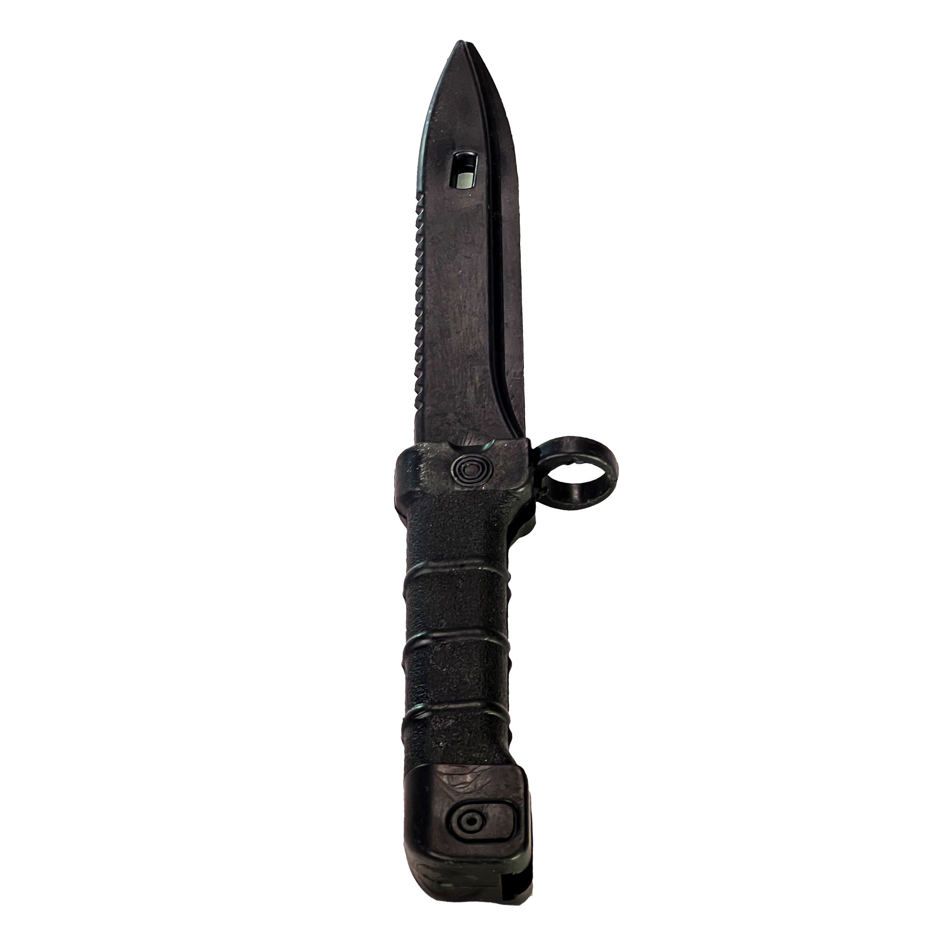 High quality polypropylene rubber Ontario M9 Bayonet Style Training Knife. The handle has a leather texture with three finger grooves. The spine on the handle is hollowed out, the muzzle ring is 1” in diameter. The knife tip is slightly bendable making it safe for direct contact with Actors. This is a solid rubber knife that is perfect for use in police and tactical training as well as props when used in close proximity simulated fight scenes. This is an extremely durable prop.