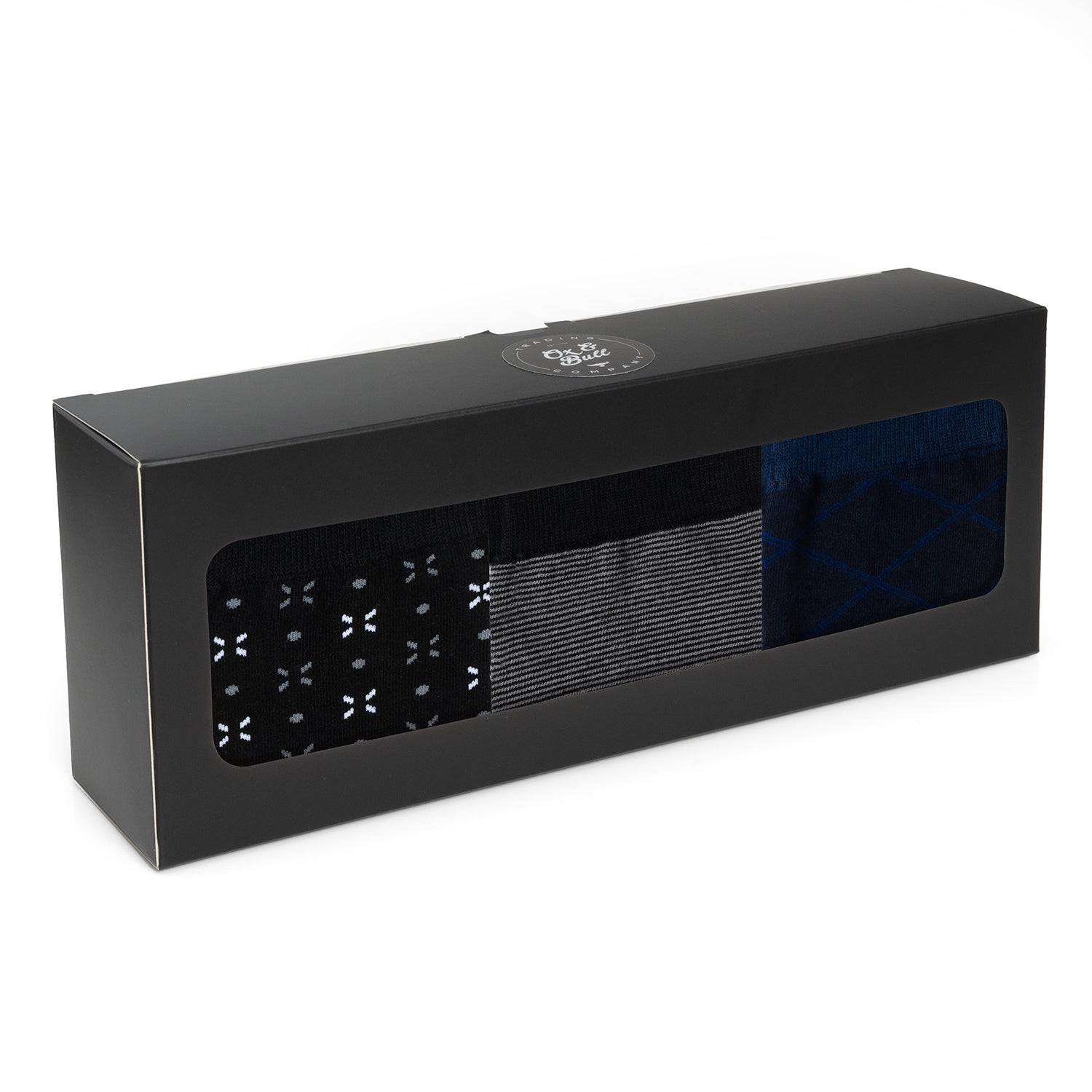 Our Ox & Bull Patterned Sock Gift Set is the perfect blend of classic and stylish. These socks aren't just accessories; they're statements of ambition and finesse. Our Striped Gray Black Men's Socks, Dot Patterned Black Men's Socks, and Grid Navy Men's Socks are curated to evoke sophistication, ensuring you command attention from the boardroom to the lounge. Our socks offer both comfort and breathability for all day wear thanks to the soft cotton blend.