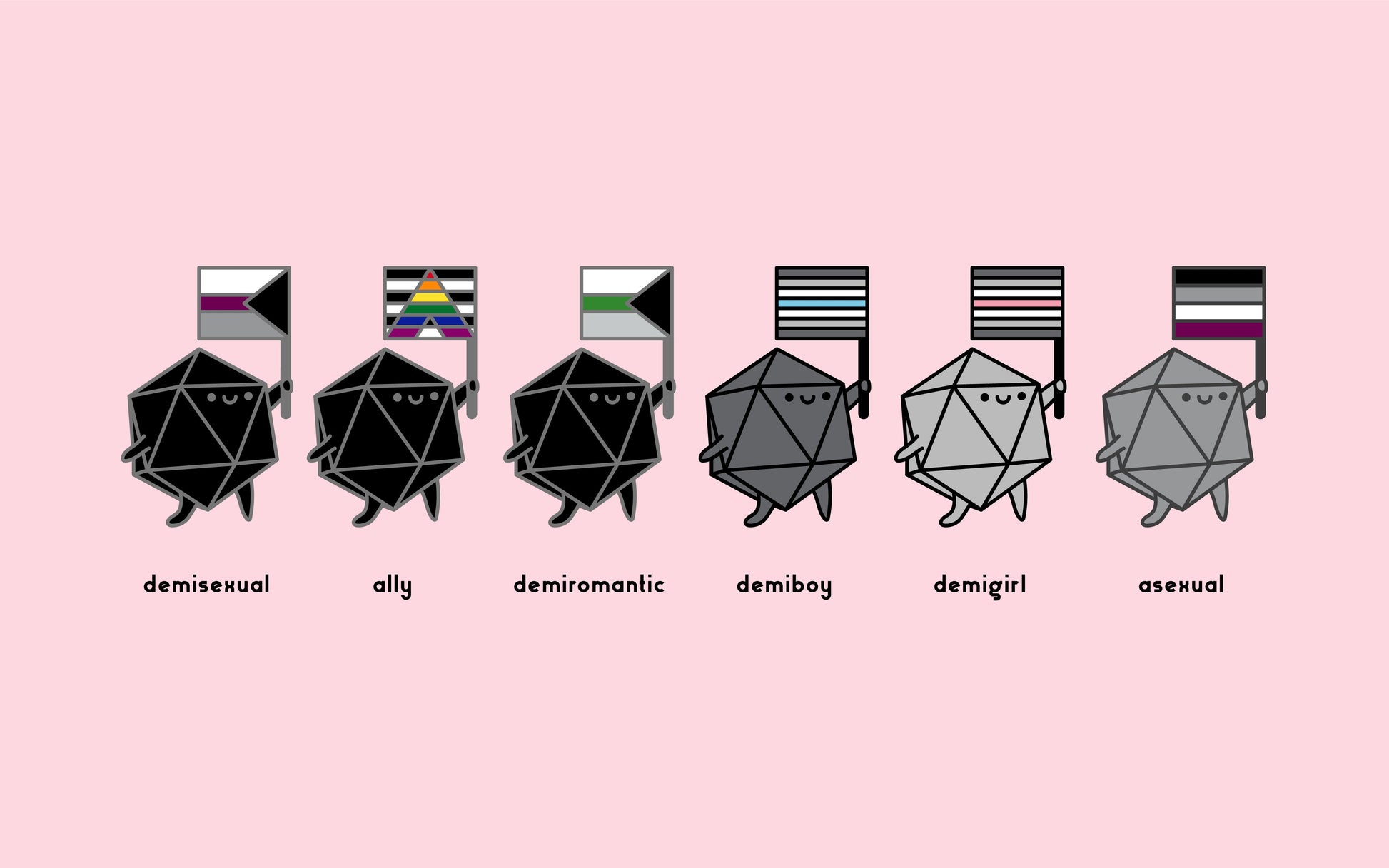 The Tiny Dice Buddies are celebrating Pride by walking with their flags! These stickers would be a great addition to your favorite water bottle, the bumper of your car, or your Dungeons and Dragons notebook.