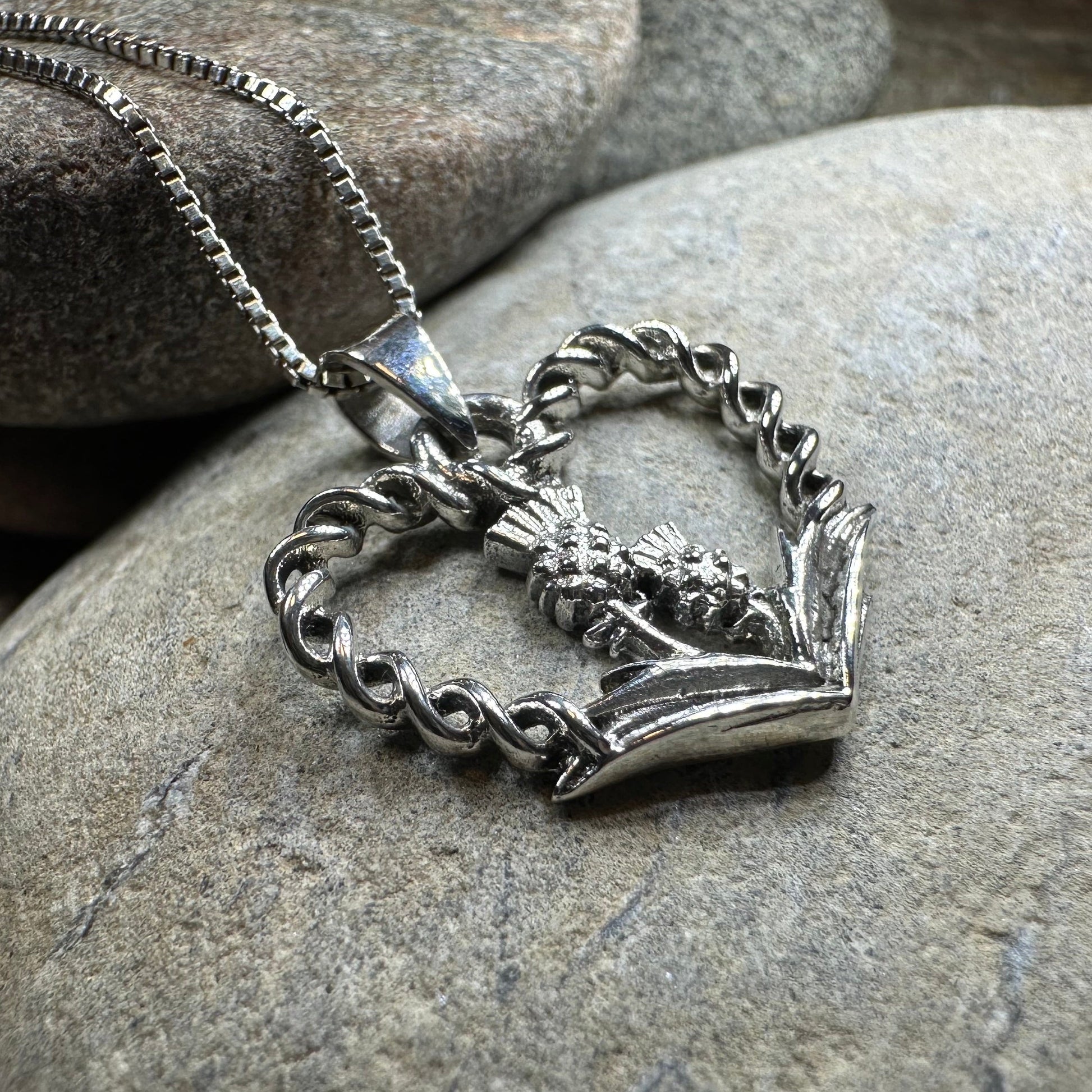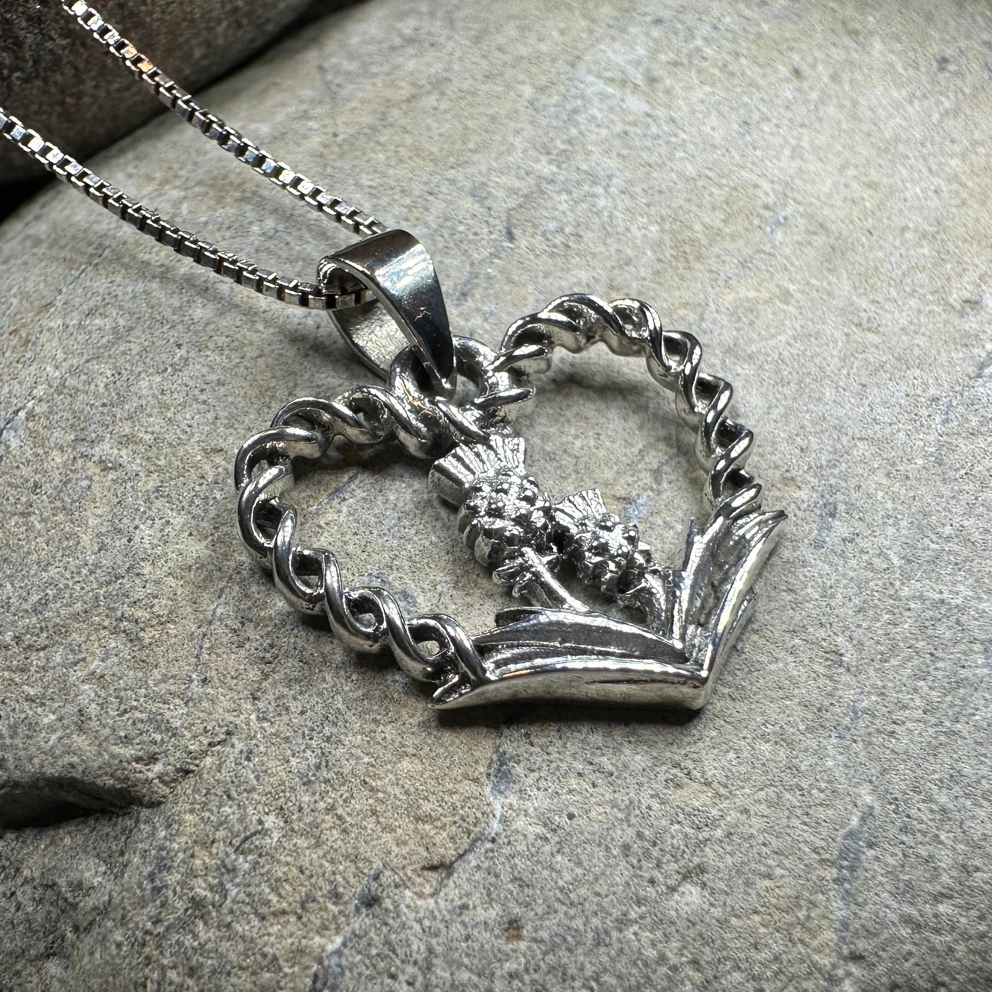 A highly attractive Luckenbooth Sterling Silver Pendant, with a design based on the romantic life of Mary Queen of Scots. The beautiful crowned heart has the thistle and rose at its center - a beautiful design.