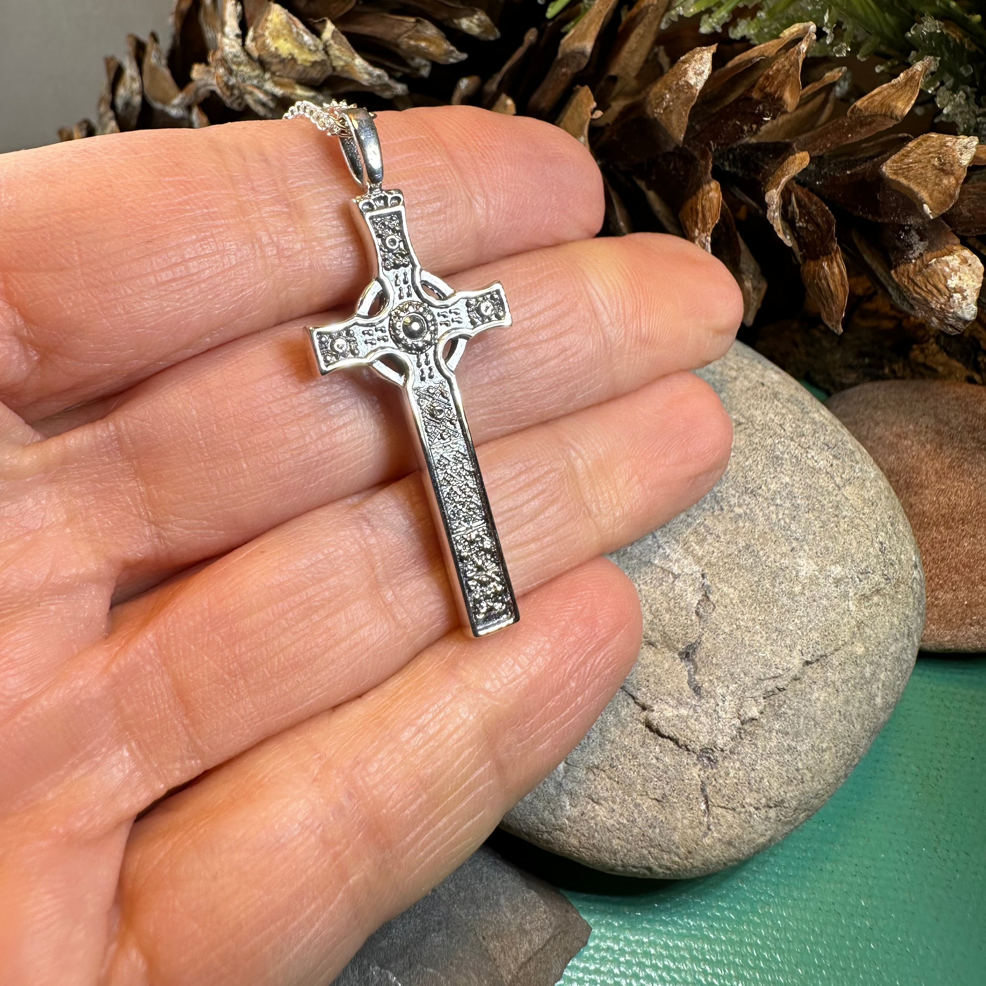 A highly attractive large Celtic Sterling Silver Cross, with a design based on a traditional stone carved Celtic Cross found in Iona, Scotland.