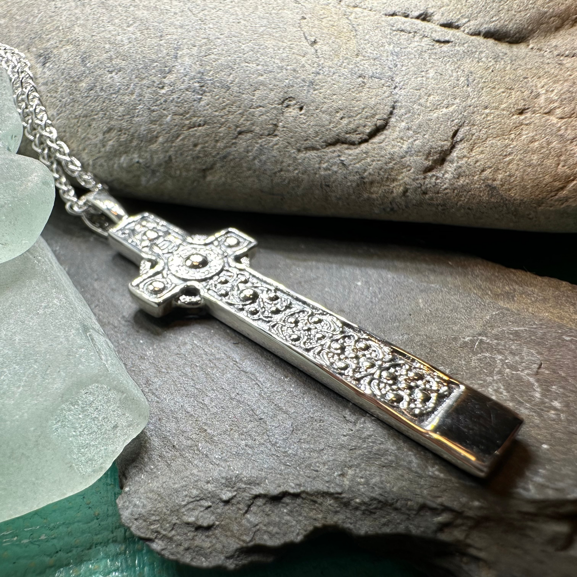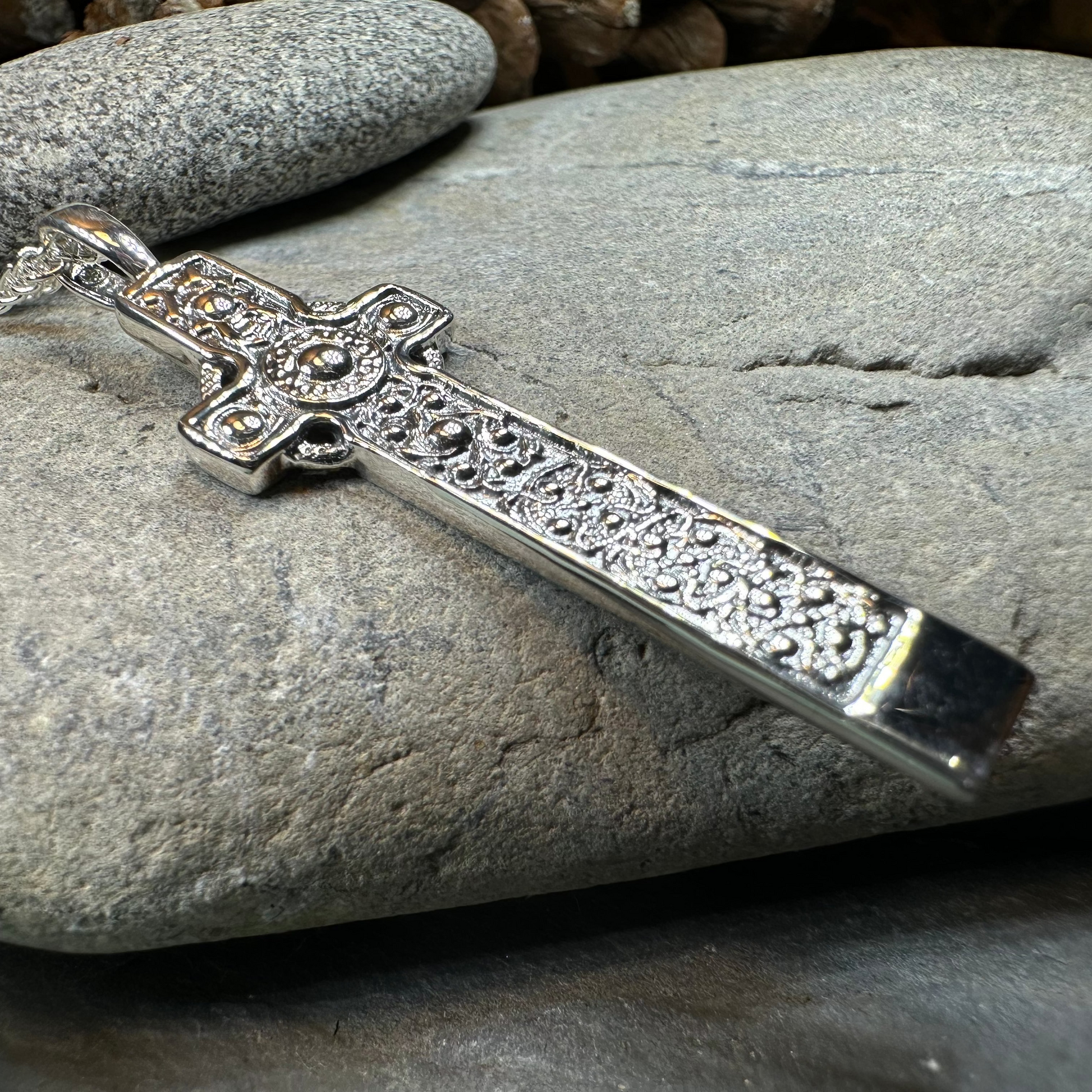 A highly attractive large Celtic Sterling Silver Cross, with a design based on a traditional stone carved Celtic Cross found in Iona, Scotland.