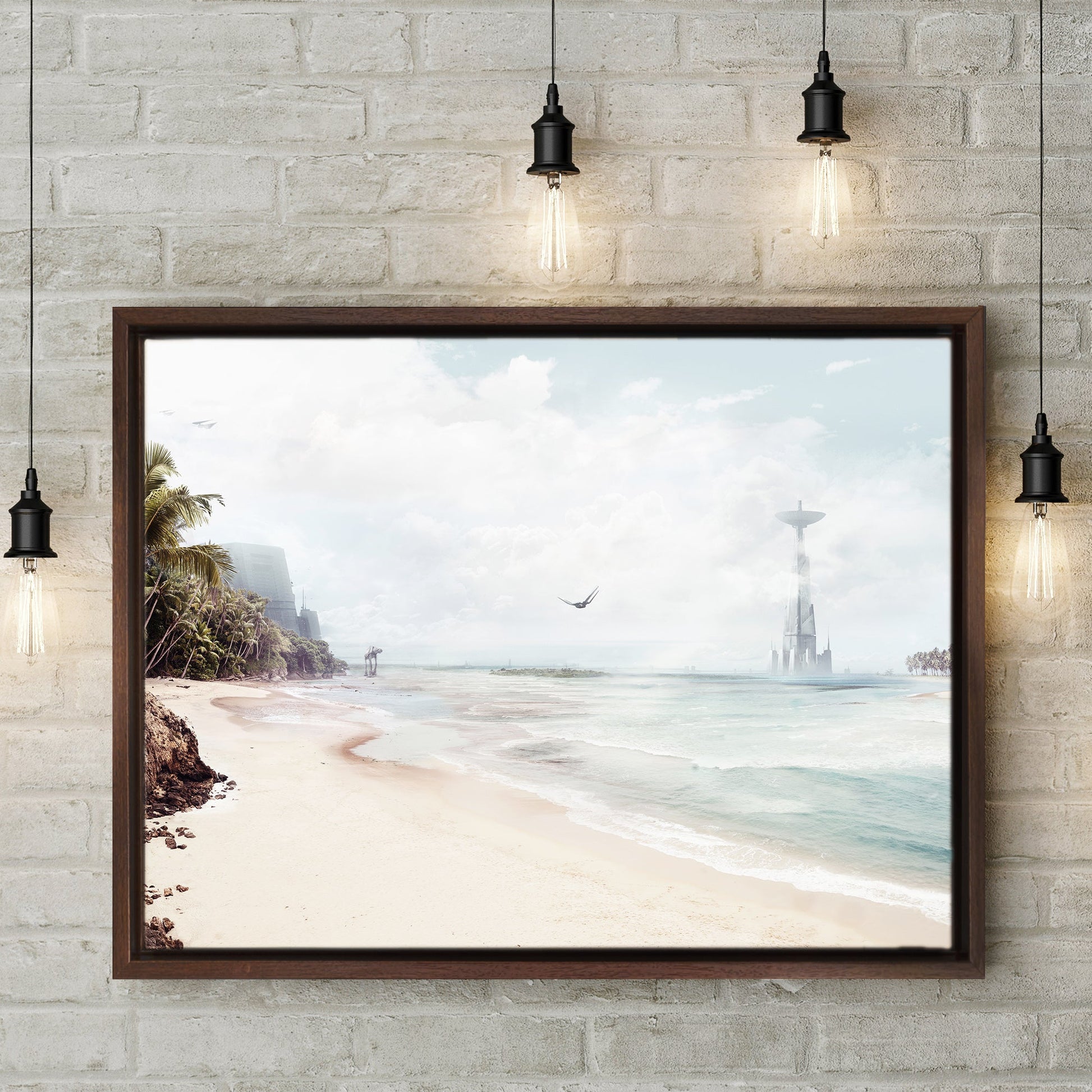 This framed Star Wars canvas print captures the beauty and tension of Scarif’s sunlit shores—where paradise meets peril. Part of my Far, Far Away Places collection, it’s perfect for the imperial officer dreaming of a beach getaway. If you squint, those TIE Fighters almost look like seagulls.