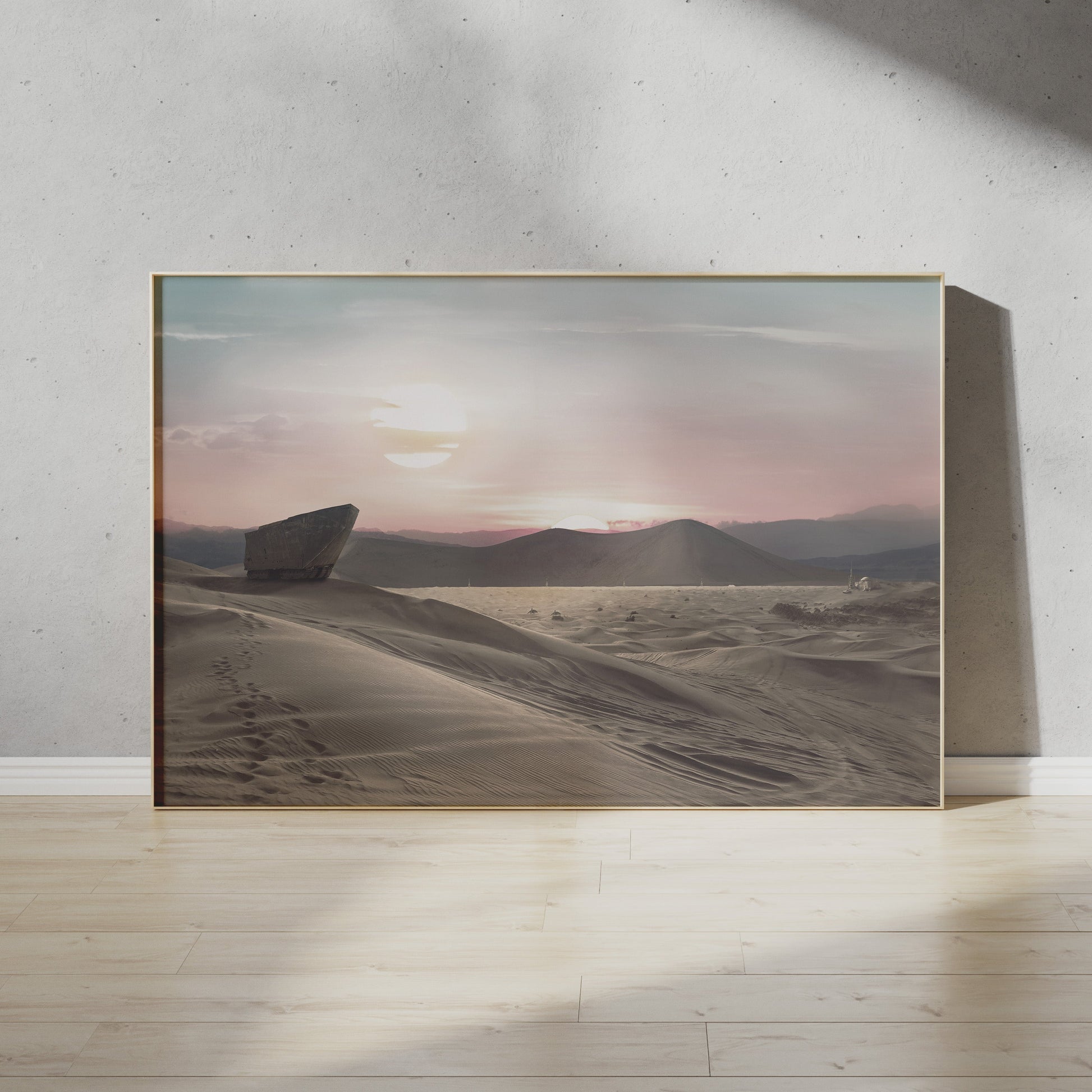 This subtle Star Wars landscape art is part of my Far, Far Away Places collection. It's the perfect gift for the moisture farmer in your life that's just dreaming of joining the Rebellion. Just look out over that beautiful binary sunset.